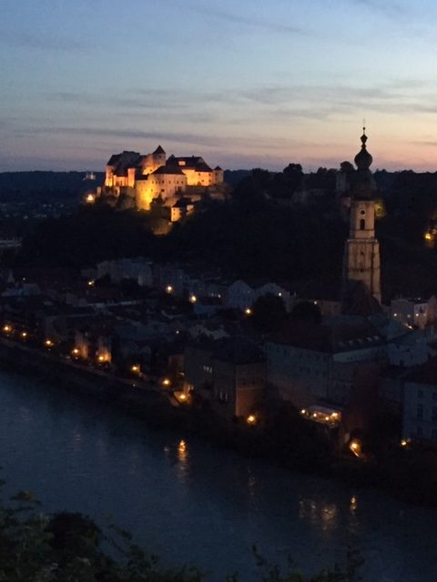 Zurück zur längsten Burg der Welt. Auf der Seeseite der Burg geht die Sonne unter und ich habe dort einen wunderschönen Sonnenuntergang erleben dürfen! Wo ich schon bei den Sonnenuntergängen bin: Wenn man die Brücke über der Salzach überquert, ist man im österreichischen Städtchen Ach an der Salzach. Von dort aus führen kleine Treppen einen Berg hinauf, von wo man einen noch schöneren Blick auf Burghausen und die Burg hat. Ein bisschen Musik an, dem Klang eines Klaviers, ein Plätzchen auf einem Baumstamm und der Einbruch der Dämmerung war magisch. Die Burgbeleuchtung setzte ein und der Himmel zeigte sich mehr und mehr in einem Farb- und Lichtspiel von orange, rosarot, purpur und unendlich vielen Blautönen. Eine Liebeserklärung der Natur.